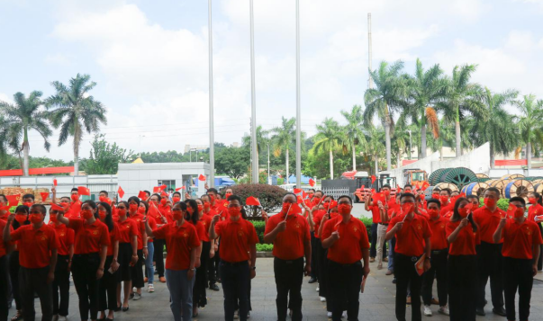 盛夏七月,热情似火!冰球突破公司已是党旗飘扬,处处洋溢着喜庆祥和的气氛。当日上午,身穿“中国红”T恤的党员等参会人员有序入场,列队数字“100”庆祝图案,表达对中国共产党的无限热爱。随着主持人一声令下,伴随着激昂雄壮的国歌声,护旗手奋力将鲜艳的五星红旗抛向天空,国旗迎着清晨第一缕阳光冉冉升起,全体人员庄重注视国旗,高唱国歌,脸上写满了骄傲与自豪。